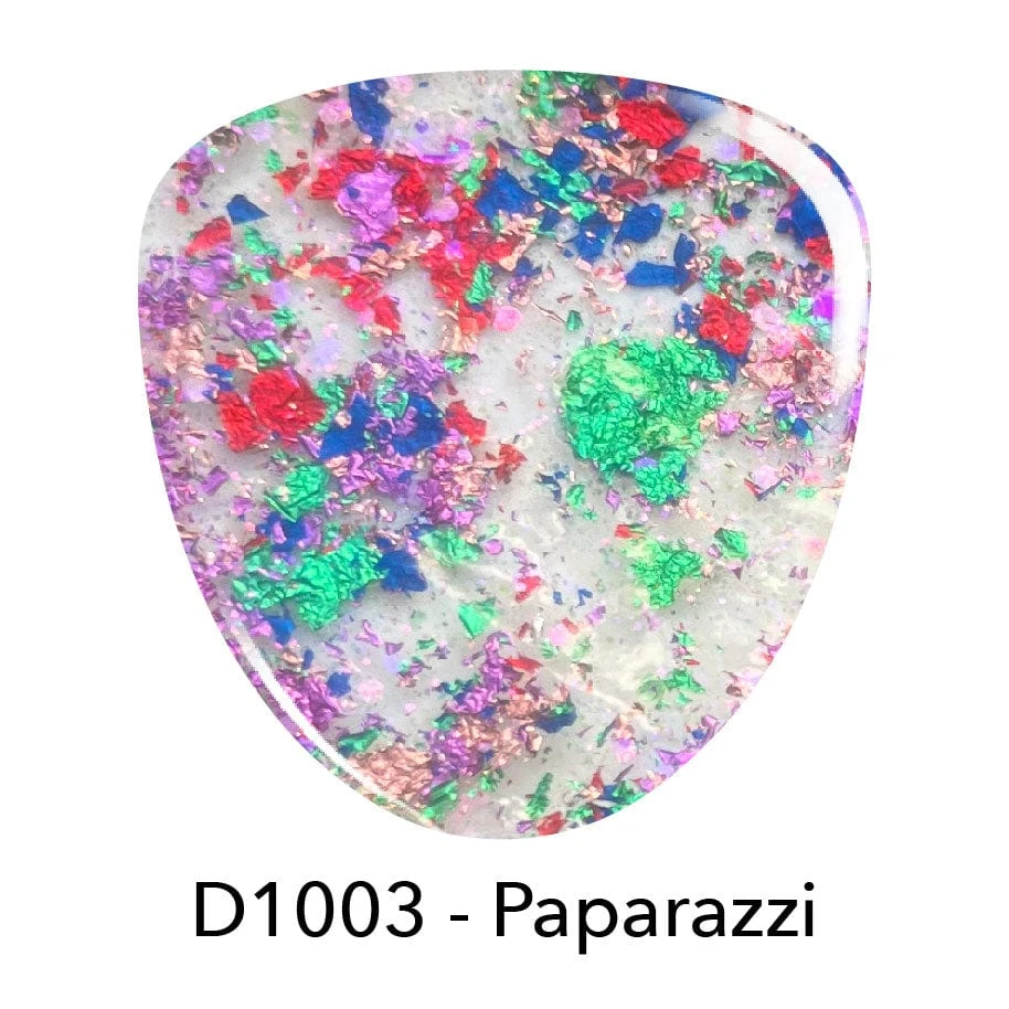 If you’ve ever wished for all eyes to be on you (& your nails) check out Paparazzi. AÂ clear base with big red, green, blue, purple and salmon pink flakes.