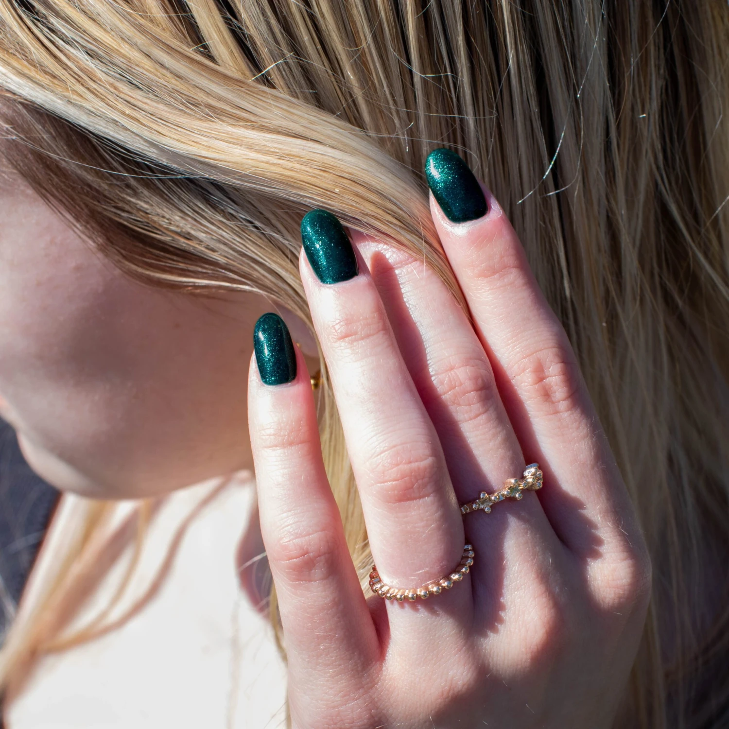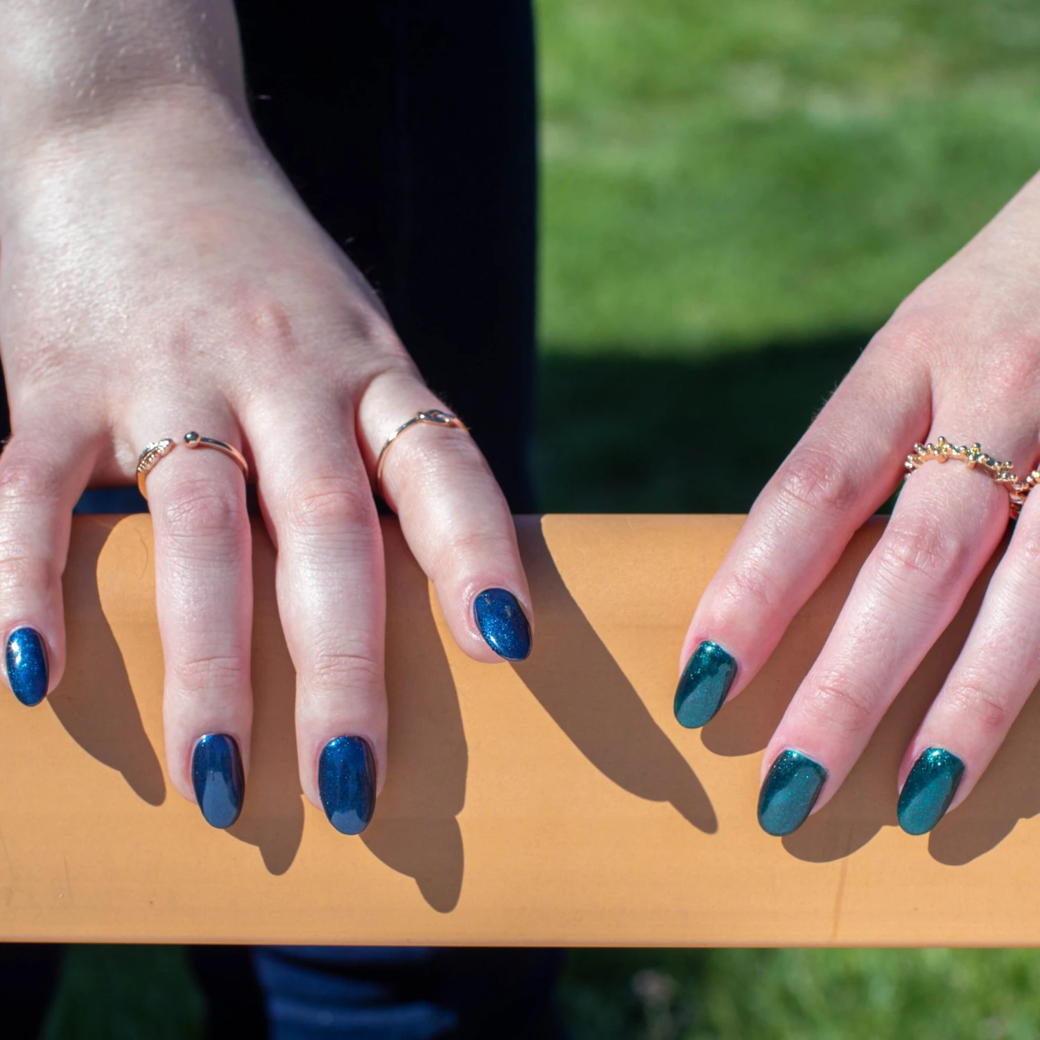 D725 Ivy is a dark green base with light green shimmers.
