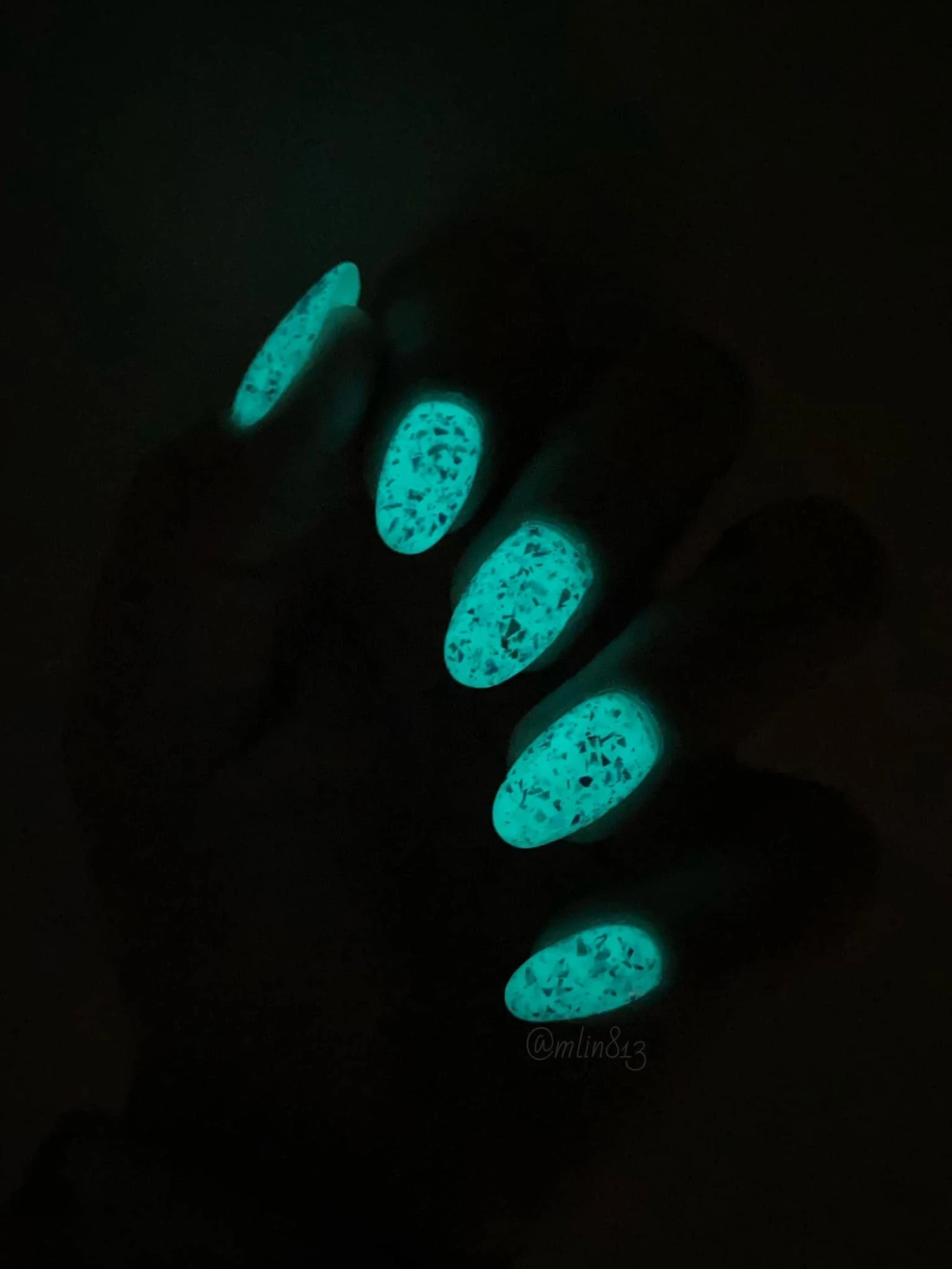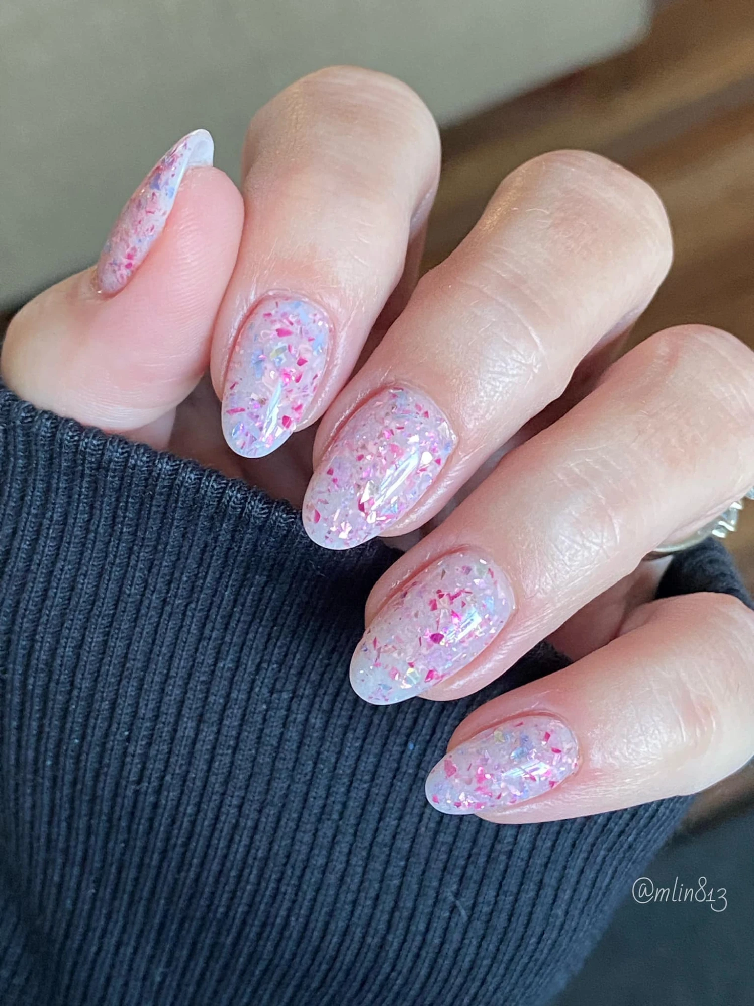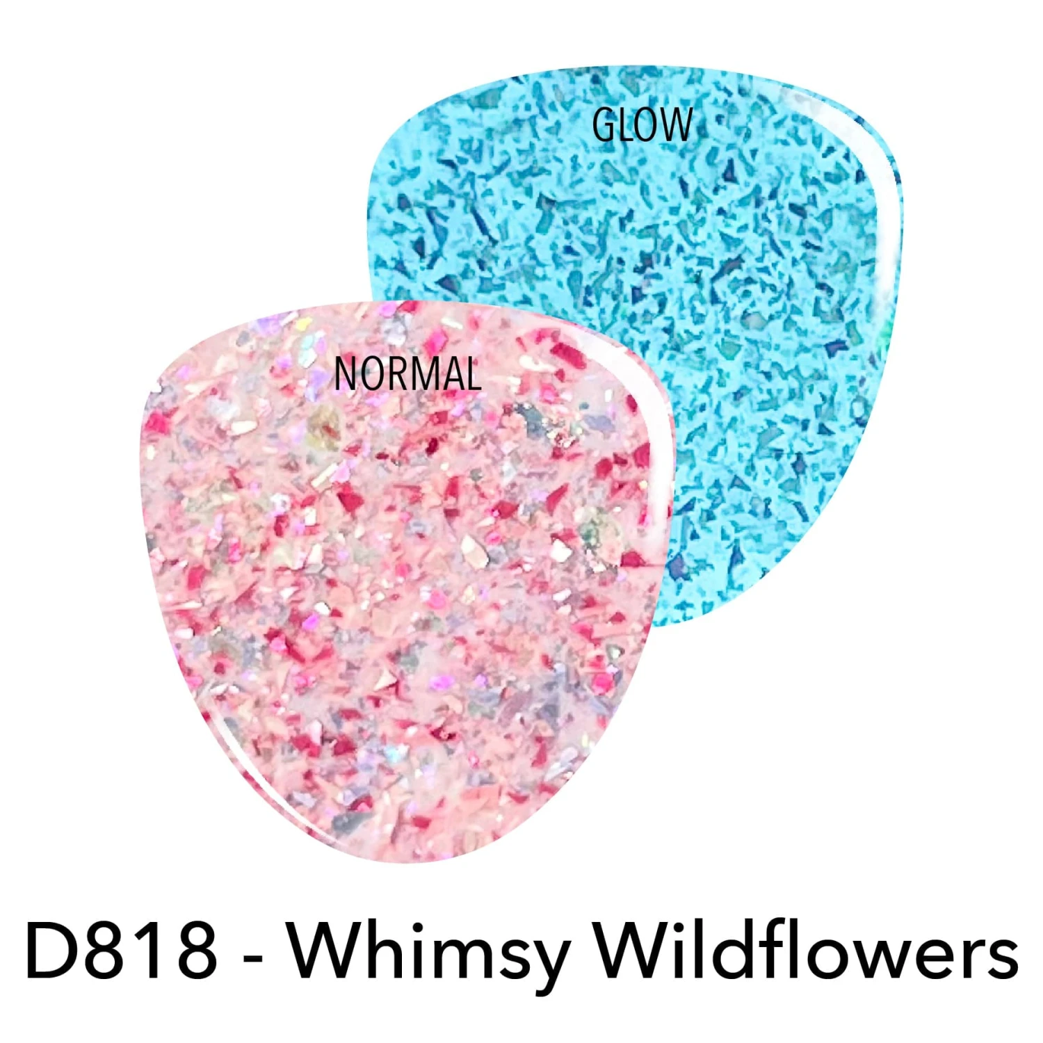 Whimsy Wildflowers is a light pink with pink and lavender flakes that glow to a turquoise blue.