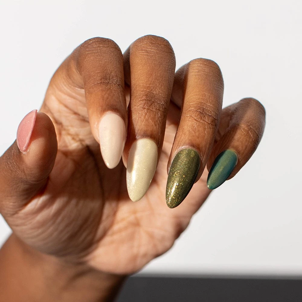 Inspired by the ethereal beauty of nature and the enchanting secrets of mystical woods, the Enchanted Forest tonal set captures the essence of the forest, showcasing a range of captivating hues that mirror the lush greens, earthy browns, and mystical blues of an ancient woodland. From deep greens reminiscent of moss-covered trees to sparkling shades of blue that imitate the shimmer of a hidden pond, these colors will bring a touch of enchantment to your dip powder manicure.