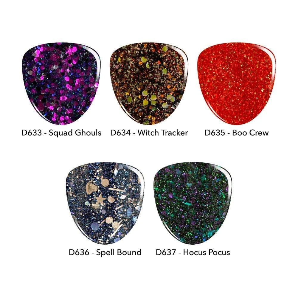 Complimentary Colors: D254 Lust, D302 Xena, D351 Helena. - D634 Witch Tracker is a black base with orange and green glitters of different sizes and shapes.