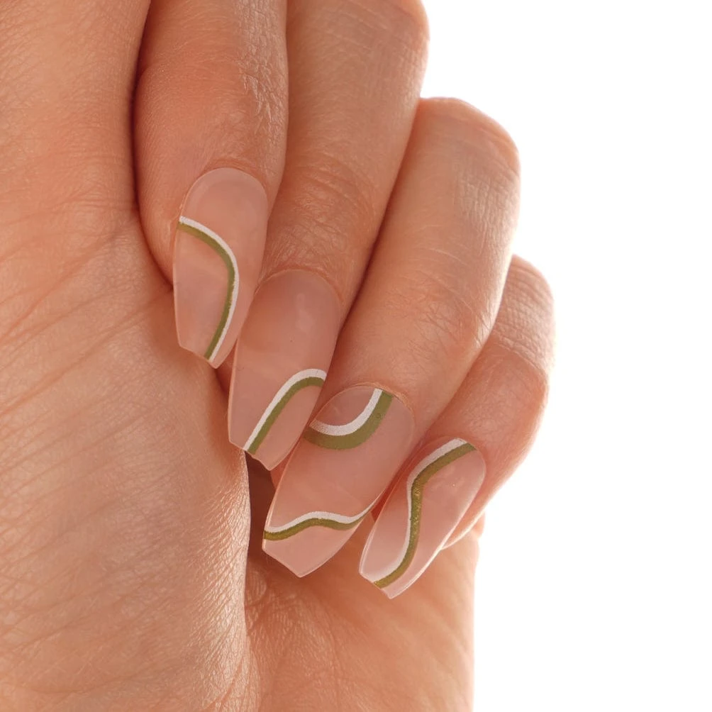 Medium coffin with a semi-sheer nude base and green and white swirls with a matte finish.
