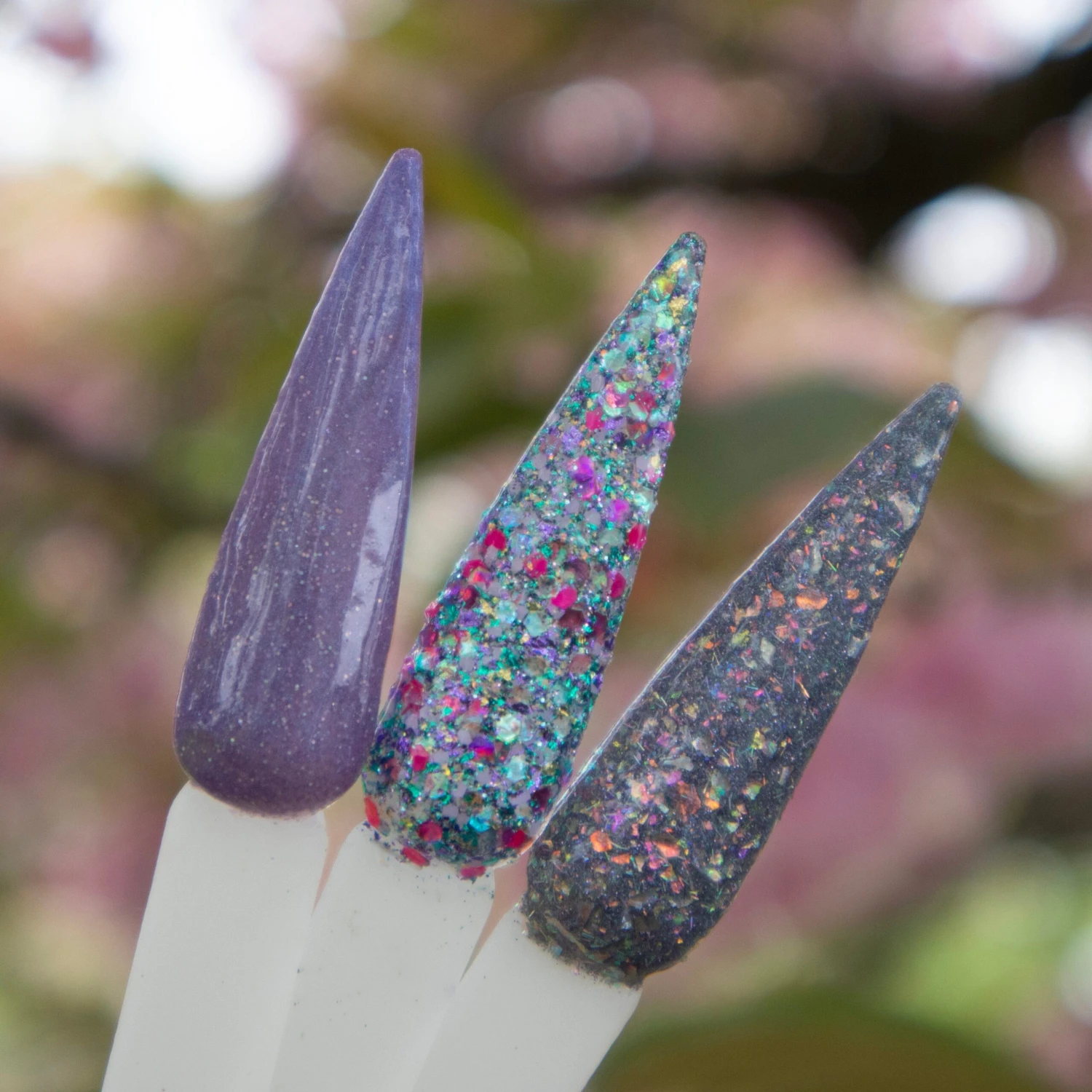 - D1086 Glam Squad is a blueish-purple glitter base with holographic and iridescent glitters and flakes. Glam Squad can be chromed for a subtle blue pearl effect.