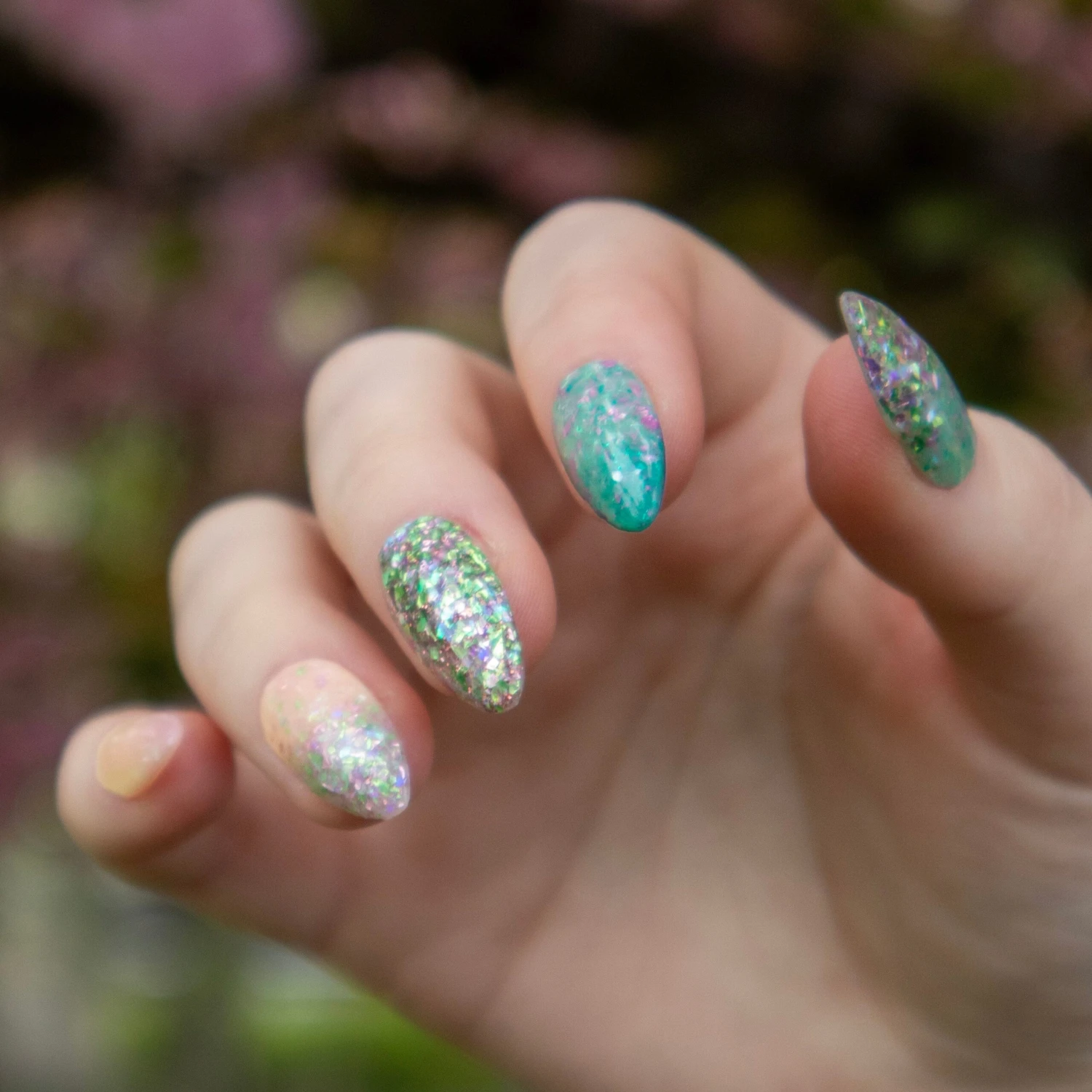 - D1085 R and R is a light green base with teal, pink and iridescent flakes.