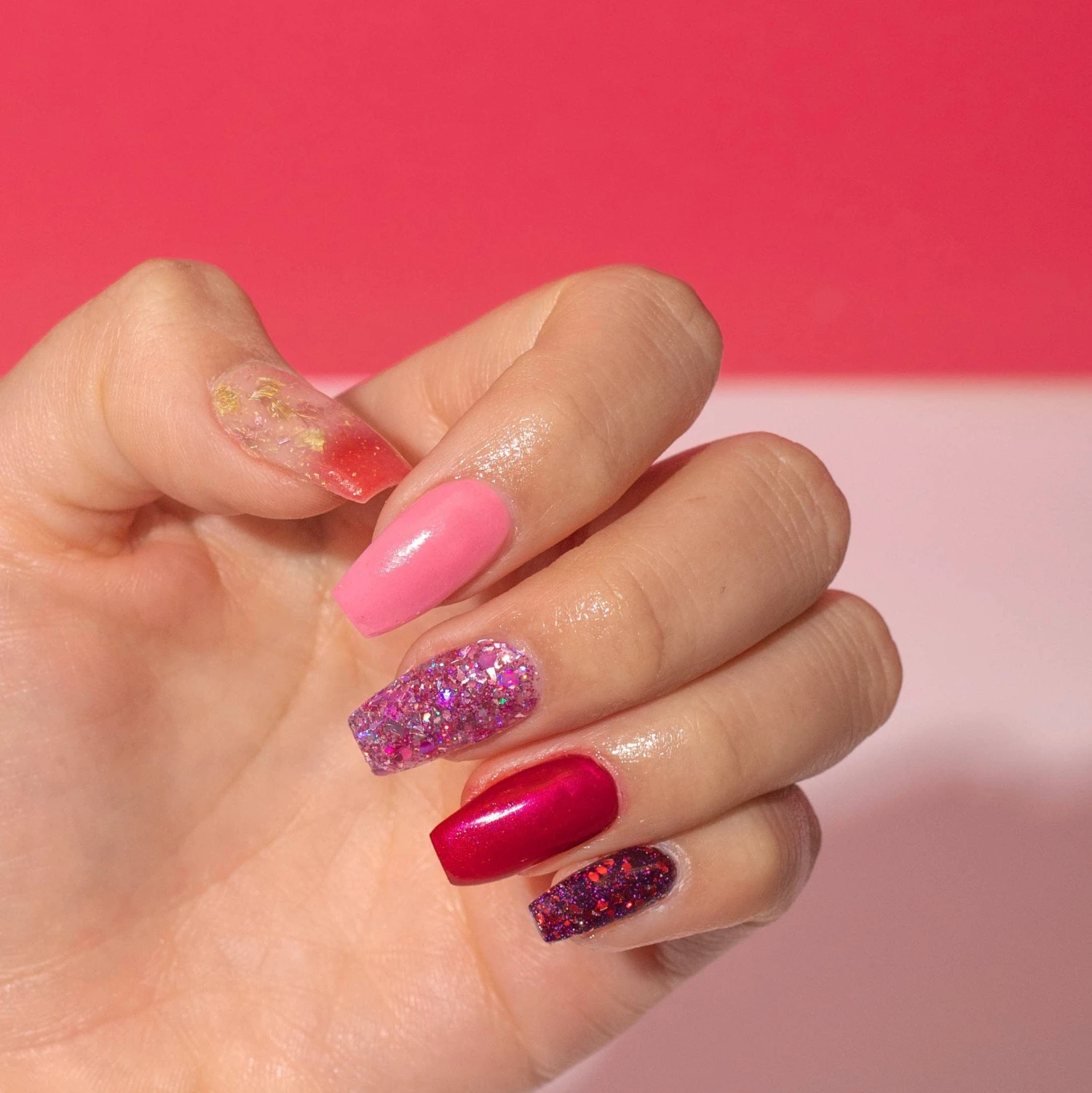 - D1050 Stuck Together: A sheer base with holographic and medium-dark pink multi-shaped glittersÂ