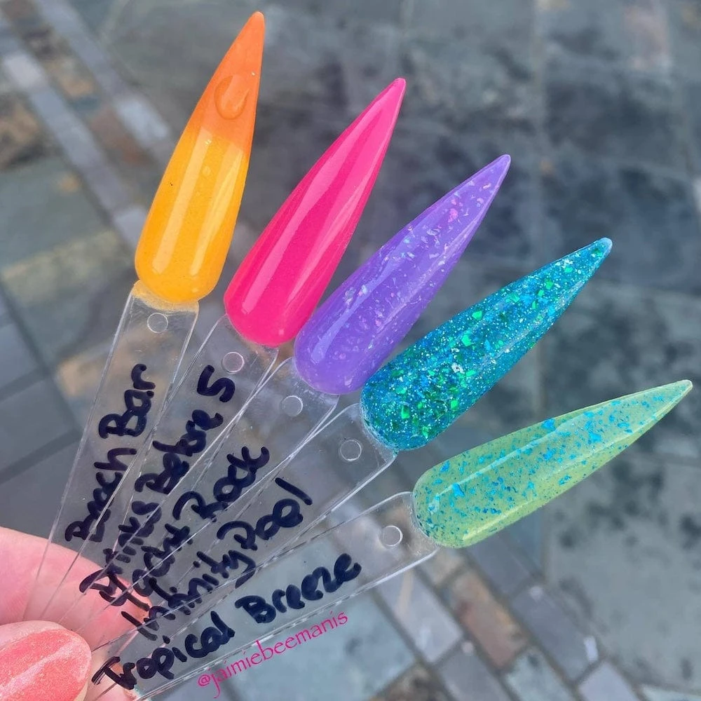 - Tropical Breeze: A bright green base with blue flakes, that changes to a blue in the sun and glows green in the dark.